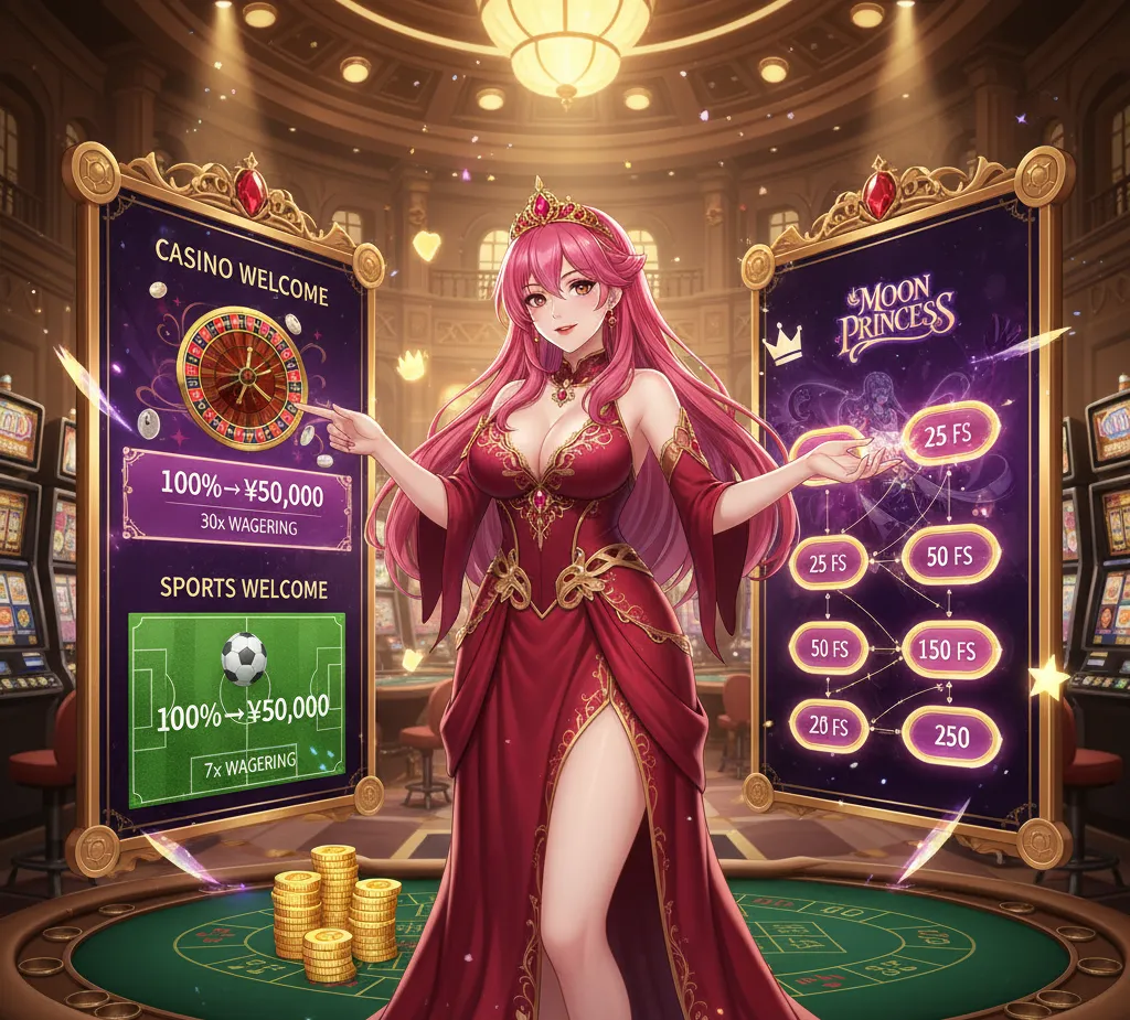 カジノパッケージは、入金額を100%マッチングし、最大¥50,000または$500までの「分離型」ボーナス構造を採用しています。これは、あなたが思っている以上に重要です。リアルマネーはわずか1倍の賭け条件を満たした後に出金できるのに対し、ボーナス資金は30倍の賭け条件が必要です。ボーナス勝利金からの最大出金は、ボーナス額の30倍に制限されており、アクティベートから14日以内に賭け条件をクリアする必要があります。2024年7月からは、Moon Princessのフリースピンがティア制で追加されました。¥2,000〜¥4,999の入金で25スピン、¥5,000〜¥9,999で50スピン、¥10,000〜¥29,999で150スピン、そして¥30,000以上でフル250スピンを獲得できます。フリースピンの勝利金はわずか1倍の賭け条件で、最大出金制限は同じく30倍です。Claim Bonusから現在のパッケージにアクセスしてください。