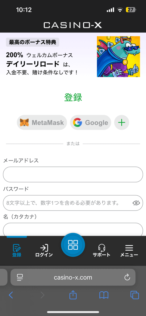 カジノエックスでは、メールアドレスを入れて登録する方法と、グーグルやMetamask、ラインアカウント、ヤフーを使うソーシャルメディア登録が用意されています。
