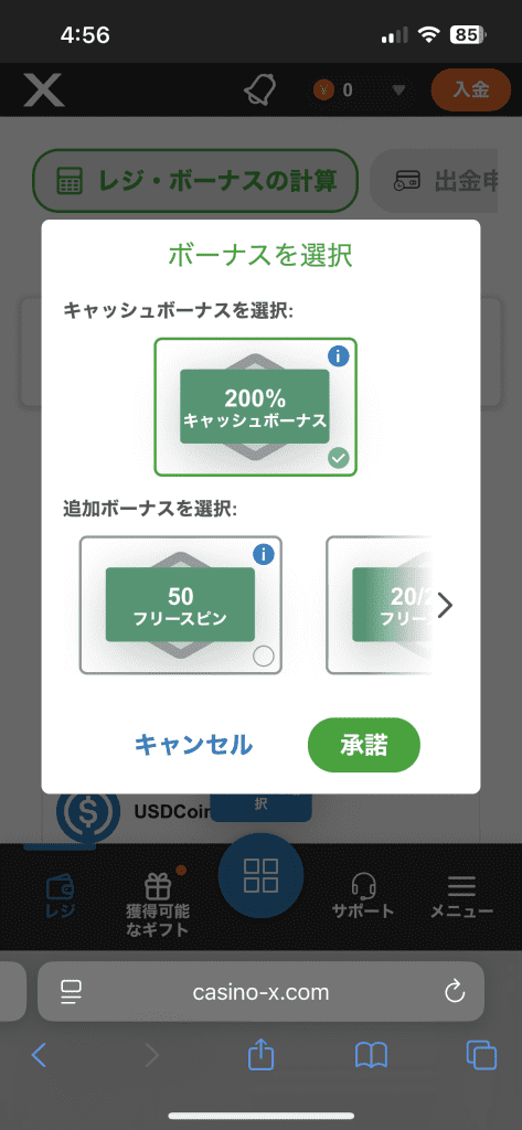 カジノエックスのボーナスの獲得方法はカンタン。入金ページにいき、利用したいボーナスにチェックを入れると自動でボーナスが進呈されます。